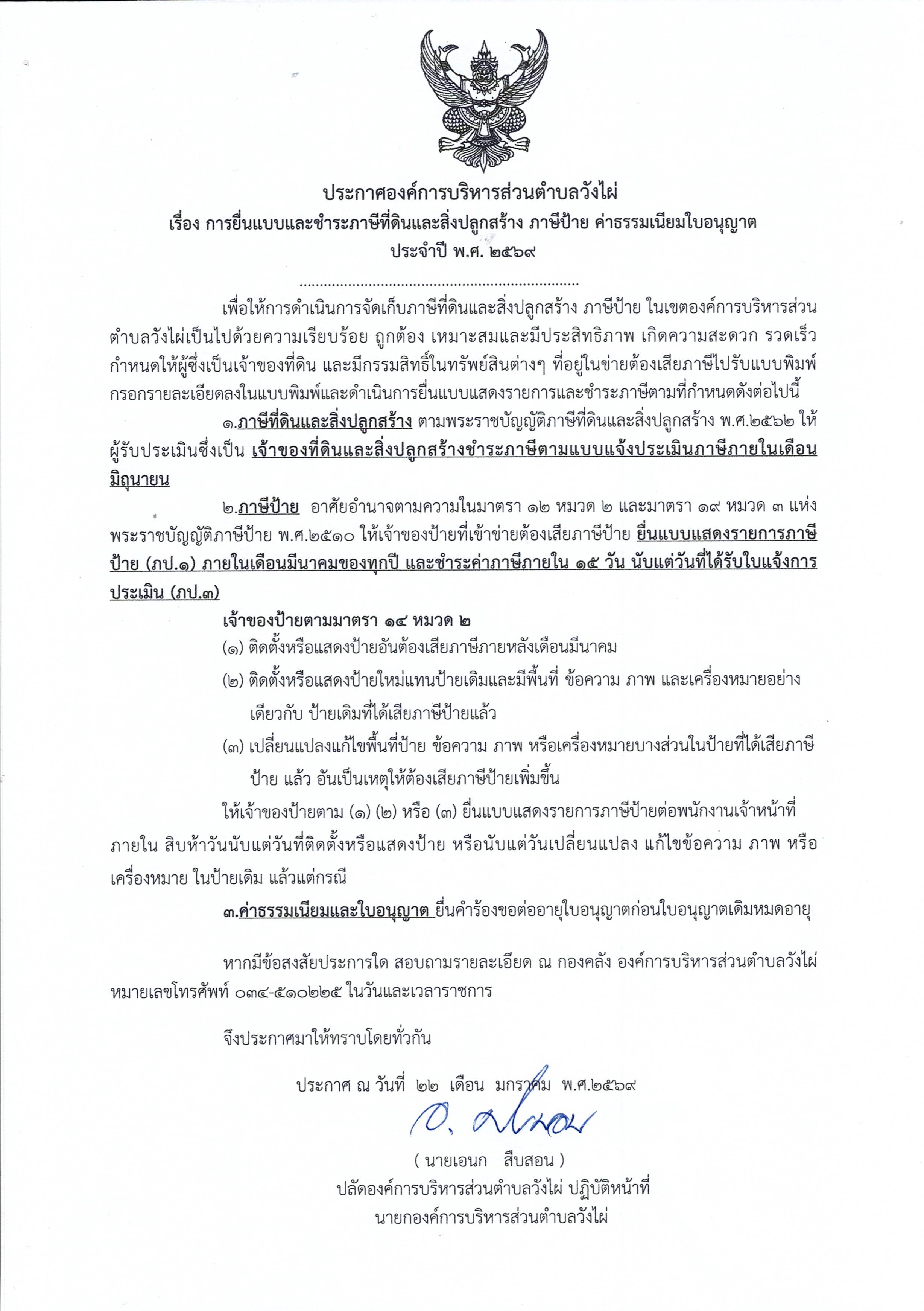 การยื่นแบบและชำระภาษีที่ดินและสิ่งปลูกสร้าง ภาษีป้าย ค่าธรรมเนียมใบอนุญาต ประจำปี พ.ศ.2569